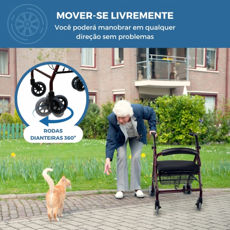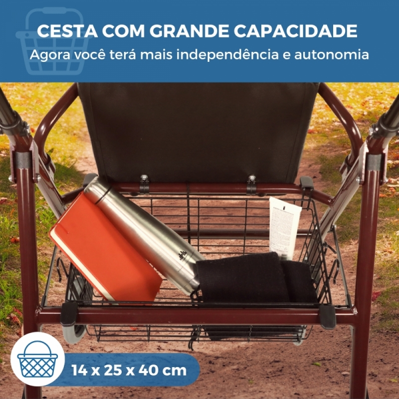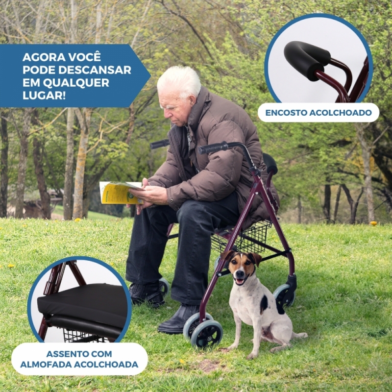 Este incrível pack é composto pelo andarilho modelo Prado na cor bordô e uma almofada anti escaras feita especialmente para caminhantes.