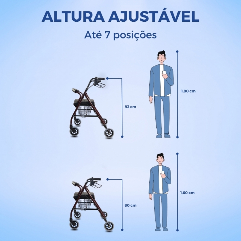 Este andarilho de alumínio possui assento e encosto acolchoados para garantir conforto e segurança, além de descanso adequado após os esforços. Inclui uma cesta projetada para guardar seus pertences com segurança e conforto enquanto você caminha. Você pode posicioná-lo sob o assento e na frente do andarilho.