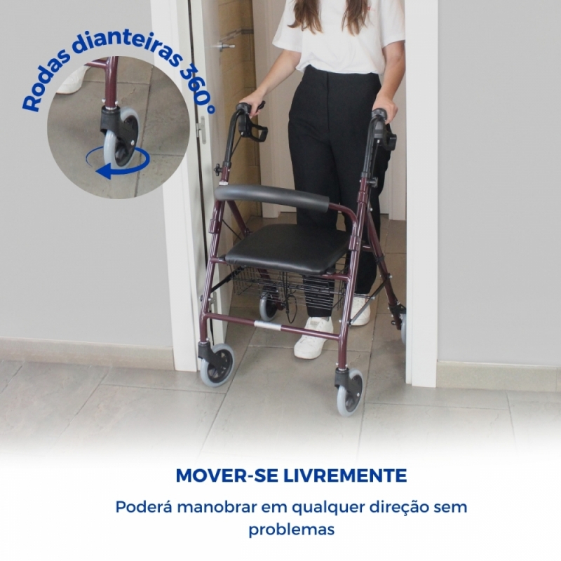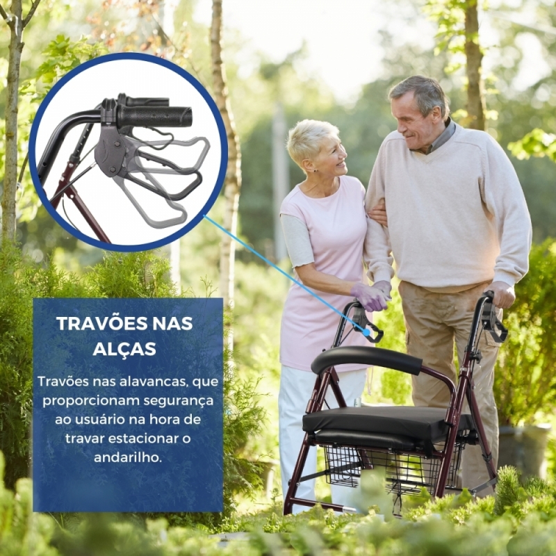 As alças do andarilho com assento são ergonômicas ajudando a distribuir e amortecer o peso e reduzir o cansaço durante o uso. Além disso, incluem freios de ativação suaves para parar o andarilho no momento desejado e sem esforço, também oferece a possibilidade de deixá-los travados para garantir a imobilização do andarilho, por exemplo, ao sentar no assento. Se o andarilho precisar ser completamente imobilizado, as alavancas do freio devem ser puxadas para baixo e as rodas travadas.