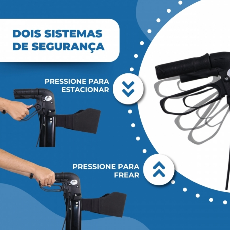 BLOQUEIO: Caso seja necessário imobilizar completamente o andador, deve-se puxar as alavancas do travão para baixo e as rodas serão travadas. Para desbloquear você tem que puxar as alças para cima.