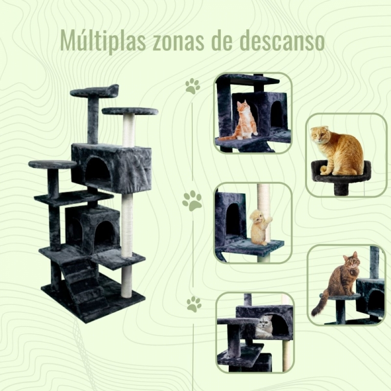 DESCANSO: O arranhador de gatos contém dois abrigos para o gato descansar. Esses animais adoram se esconder em locais fechados. Portanto, eles encontrarão este local ideal para descansar. Assim o localizaremos e assim tanto ele como nós estaremos calmos.