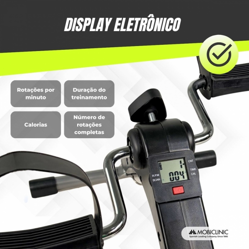 DISPLAY ELETRÔNICO INTEGRADO : Exibe informações úteis sobre o treino, como tempo, número de rotações, rotações por minuto e estimativa de calorias. Inclui uma função de varredura para alternar automaticamente entre os dados.