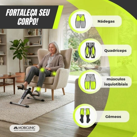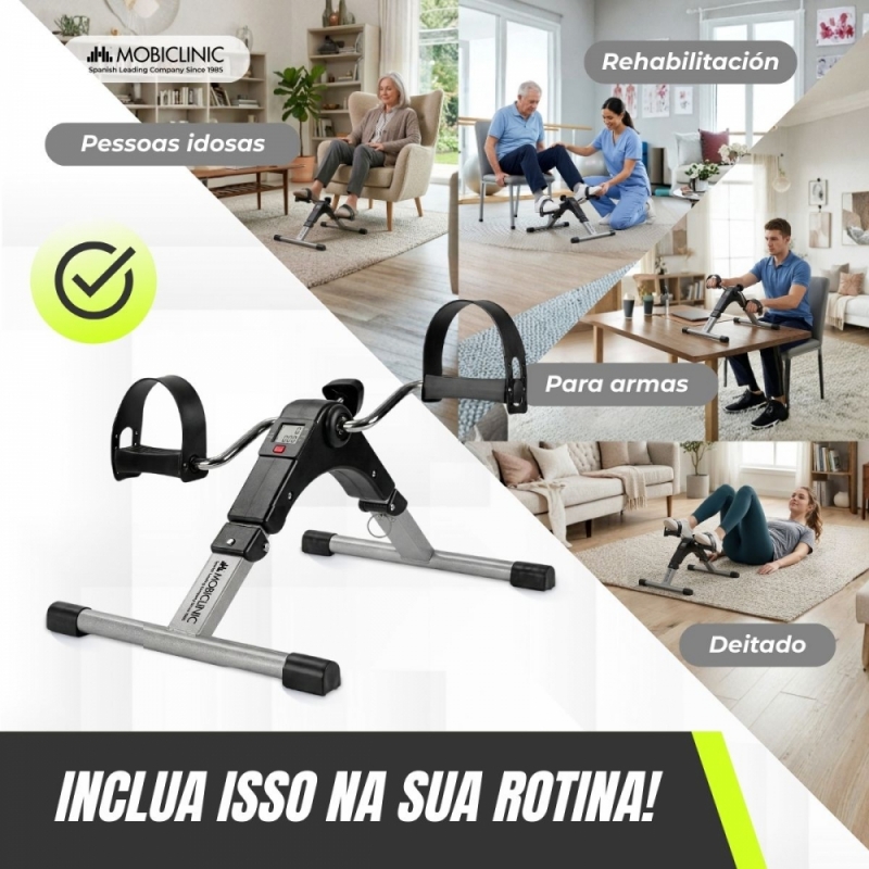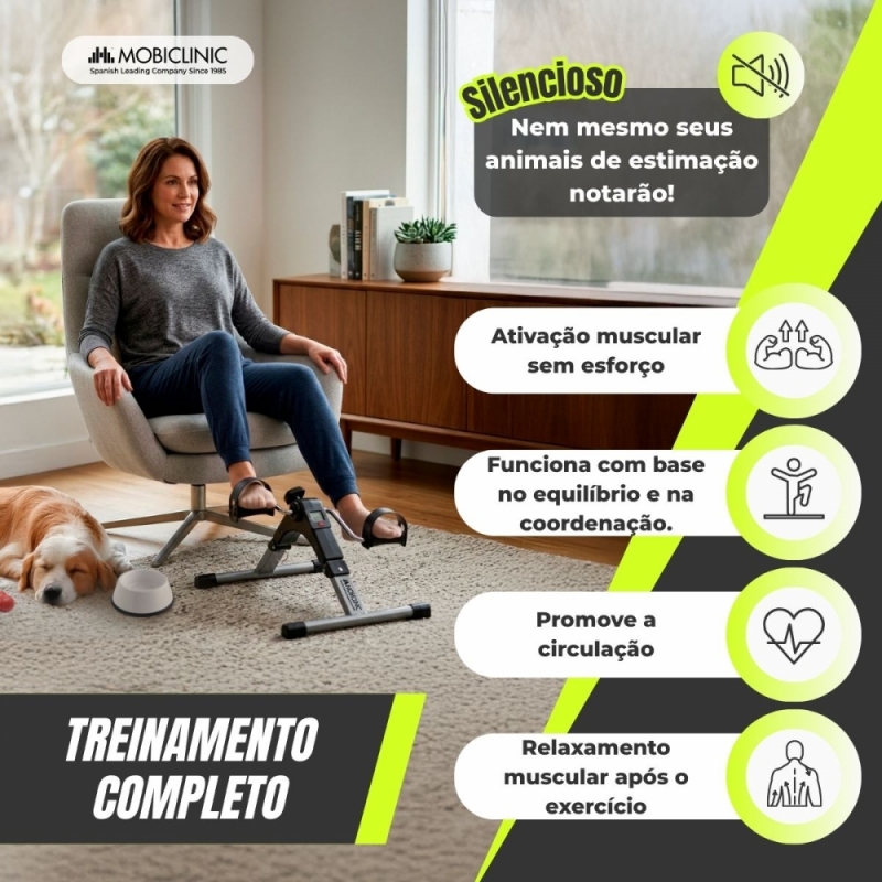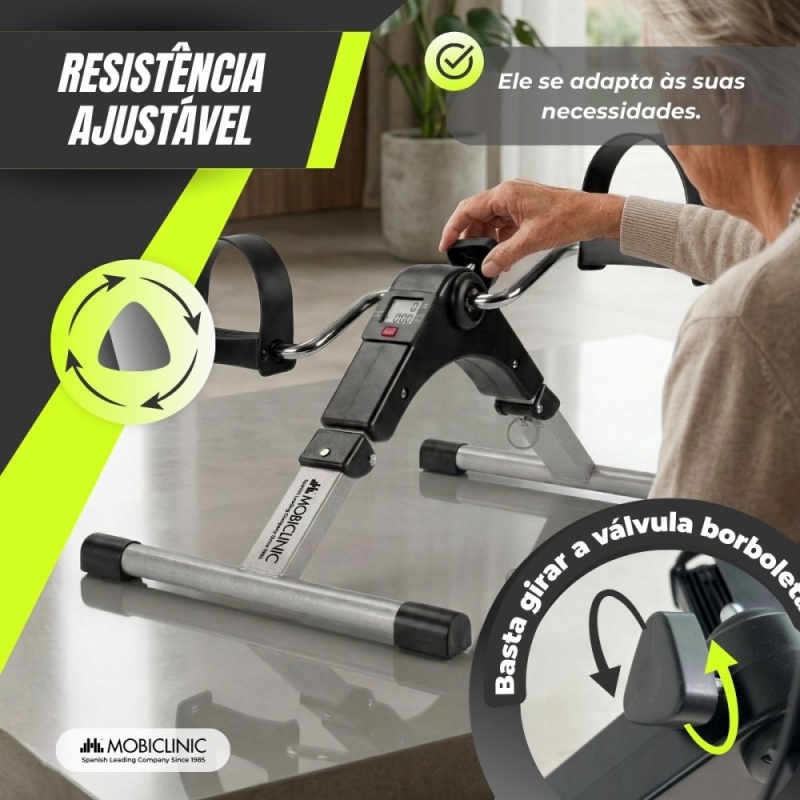 Este exercitador de pedais com resistência ajustável permite regular manualmente a intensidade da pedalada através de um botão central, adaptando-se ao nível de condicionamento físico e às necessidades de cada usuário. Sem necessidade de eletricidade, tomadas ou cabos, oferece total liberdade de uso e instalação imediata.