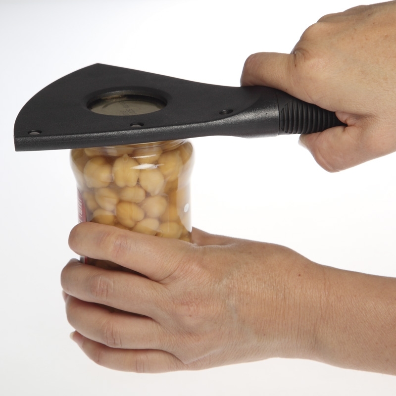 Abridor de plástico com alça ergonômica grossa que facilita a aderência mesmo com as mãos molhadas. Fácil de usar, uma vez que tem uma parte serrilhada de aço inoxidável. Uma ajuda perfeita para pessoas com problemas nas articulações superiores que querem manter sua autonomia e independência.