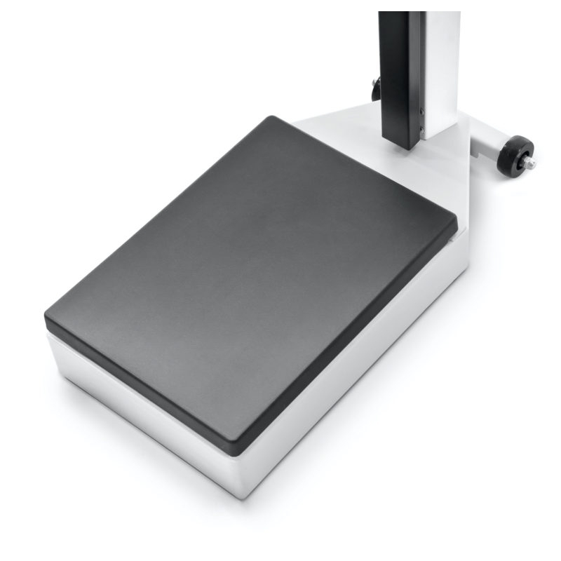 Balança com mostrador ao nível dos olhos, legível de ambos os lados, com uma haste telescópica de medição da altura e duas rodas de transporte para facilitar a mobilidade.