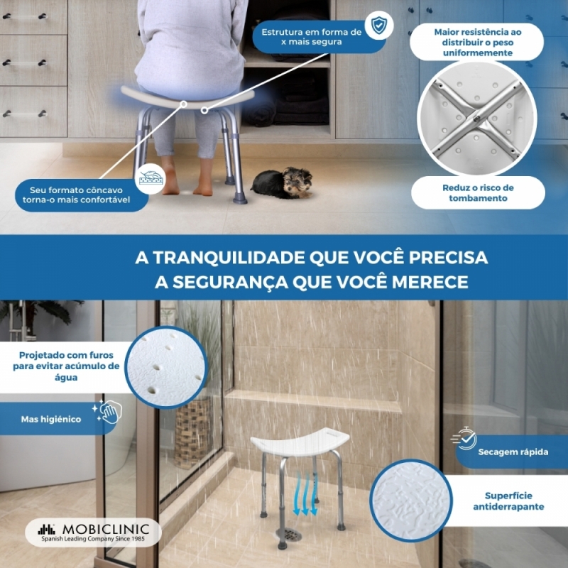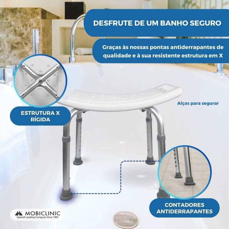 Graças às almofadas de borracha antiderrapantes nas pernas, este banco de duche adapta-se perfeitamente à superfície de apoio e garante a estabilidade necessária para o utilizador.