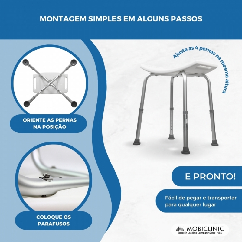 Além disso, as suas pernas são ajustáveis em altura, o que permite que o assento se adapte à altura e às necessidades do usuário ou de seu acompanhante.