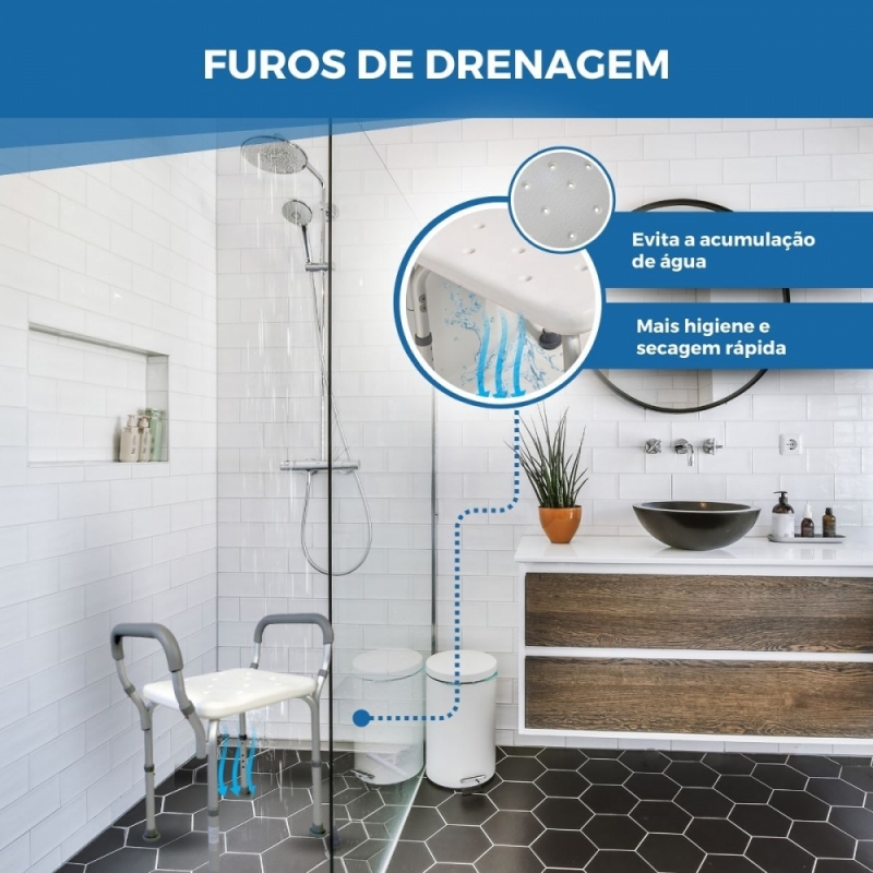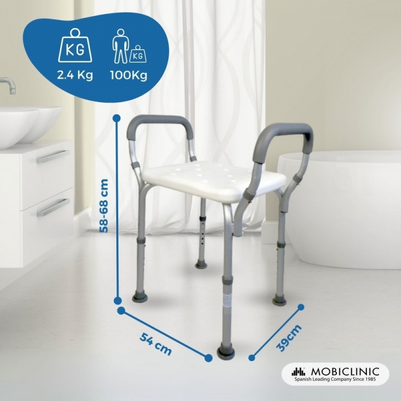 Este modelo de cadeira de banho destaca-se pelo seu preço e alta qualidade. É feito de alumínio e termoplástico, o que o torna mais leve e mais móvel. Tem 4 pernas reguláveis em altura com pés antiderrapantes que lhe permitem adaptar-se a qualquer tipo de casa de banho, tornando-o seguro para usar. Por outro lado, tem orifícios de drenagem no assento que permitem o fluxo de água.