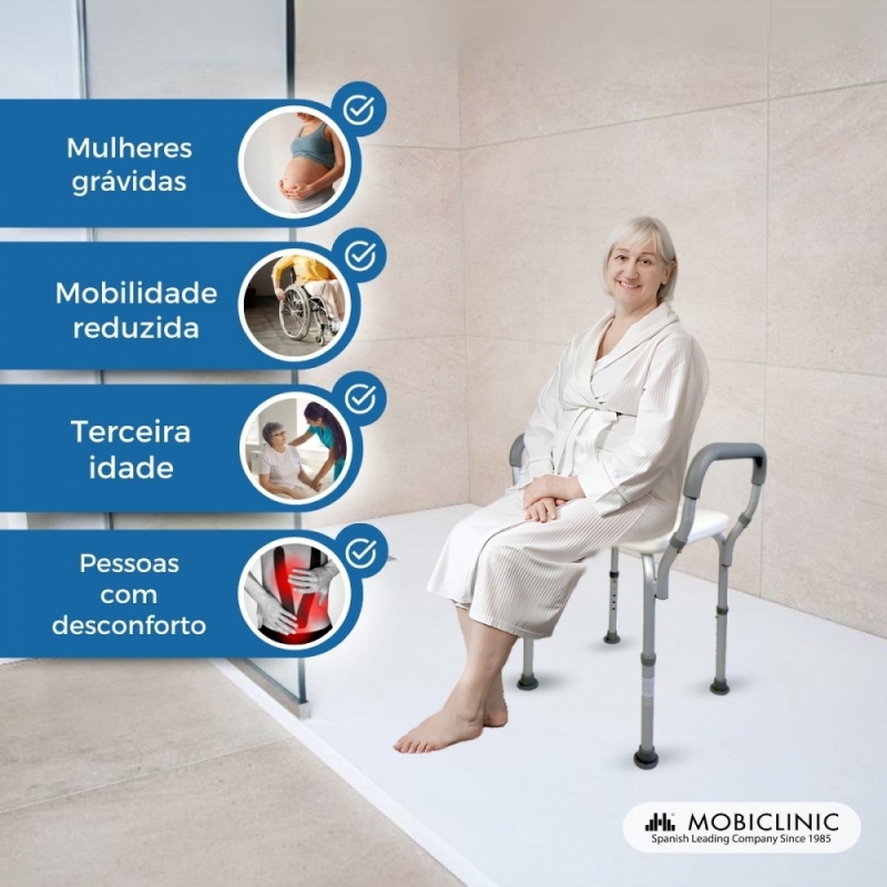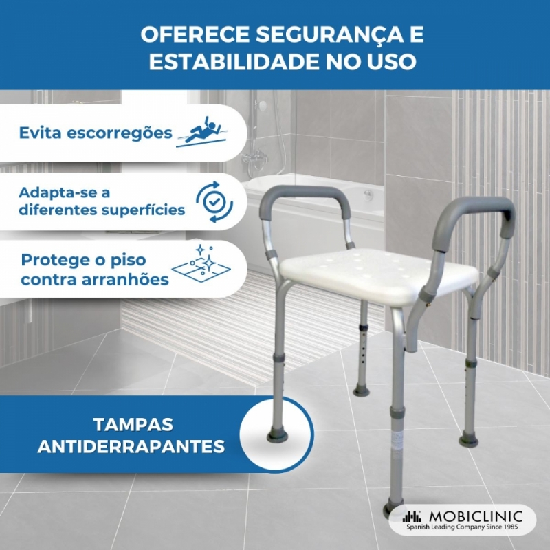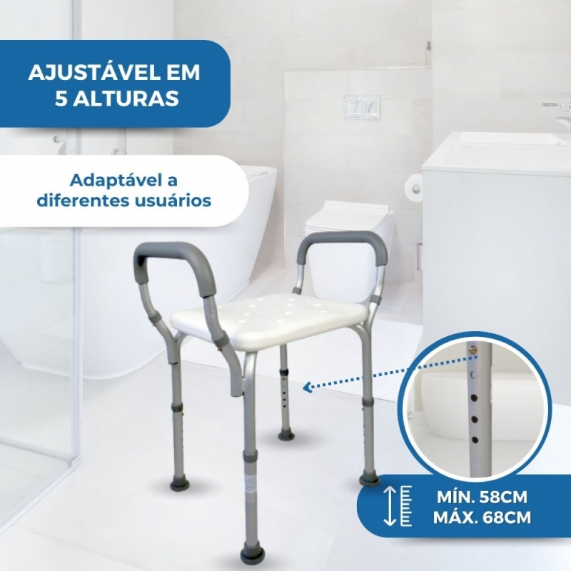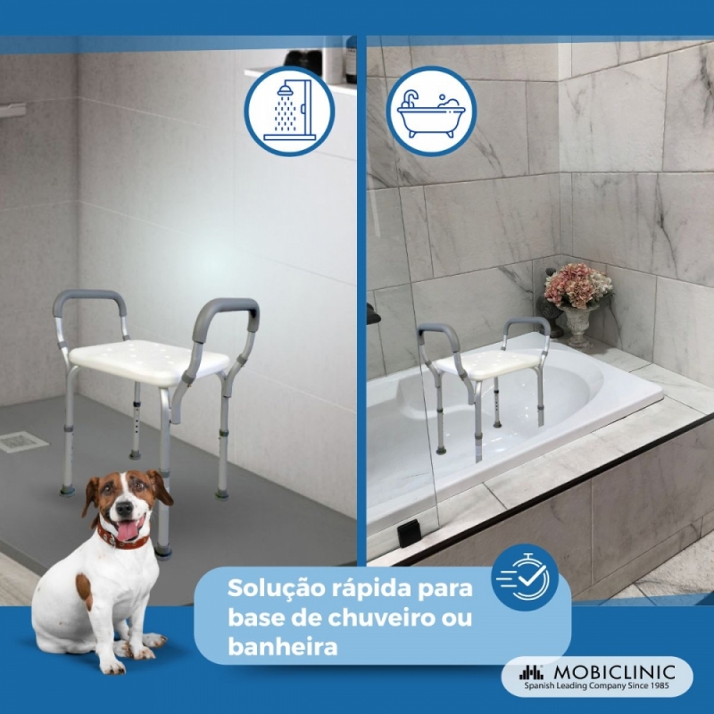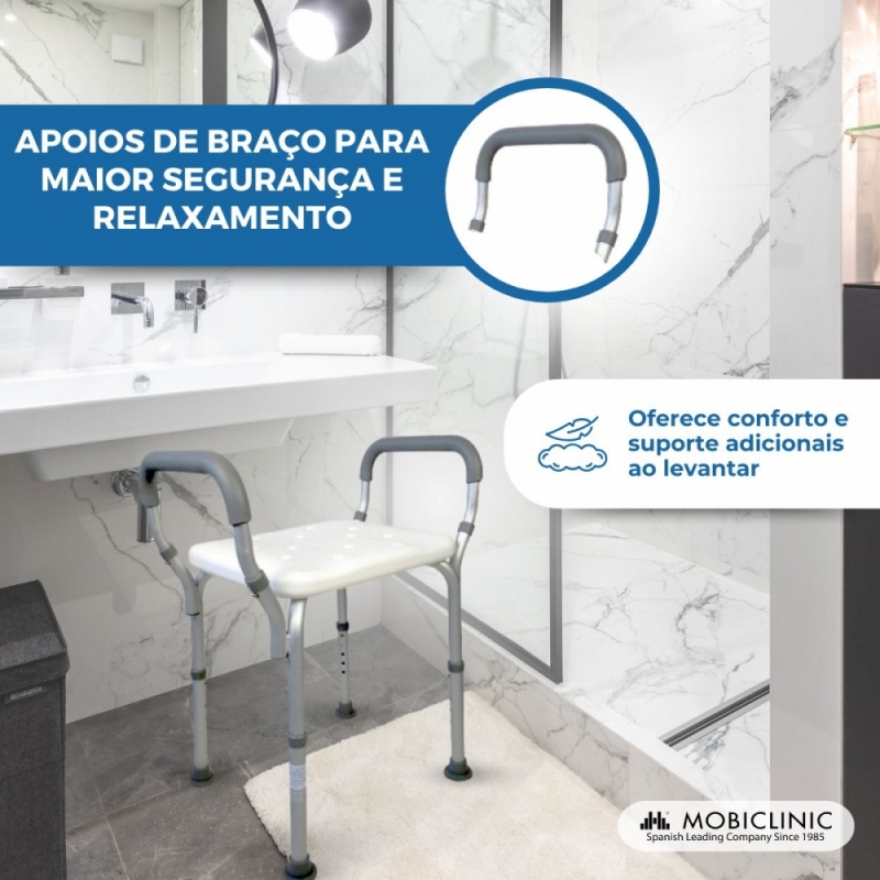 Além disso, para conforto do utilizador, os apoios de braços da cadeira de banho são forrados e muito fáceis de montar, com apenas um clique poderá colocá-los e retirá-los com total facilidade! Compre agora e ajuste-os às suas necessidades!