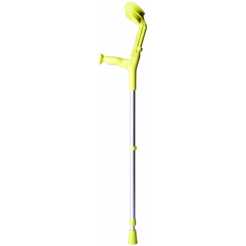 Esta muleta é muito leve e é feita de alumínio e termoplástico. Regulável em altura, com 10 posições na haste e 5 posições no cotovelo. Disponível em várias cores muito atraentes.
