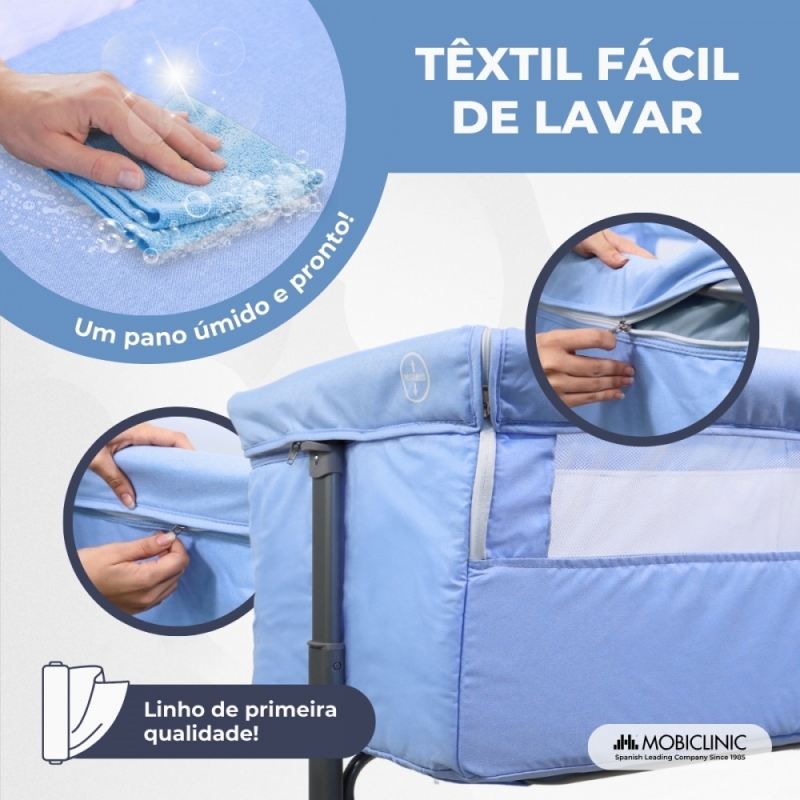 LAVÁVEL: O cesto do berço é confeccionado em tecido respirável que promove ventilação e circulação de ar adequadas. Este tecido é fácil de remover e lavar para manter a higiene.