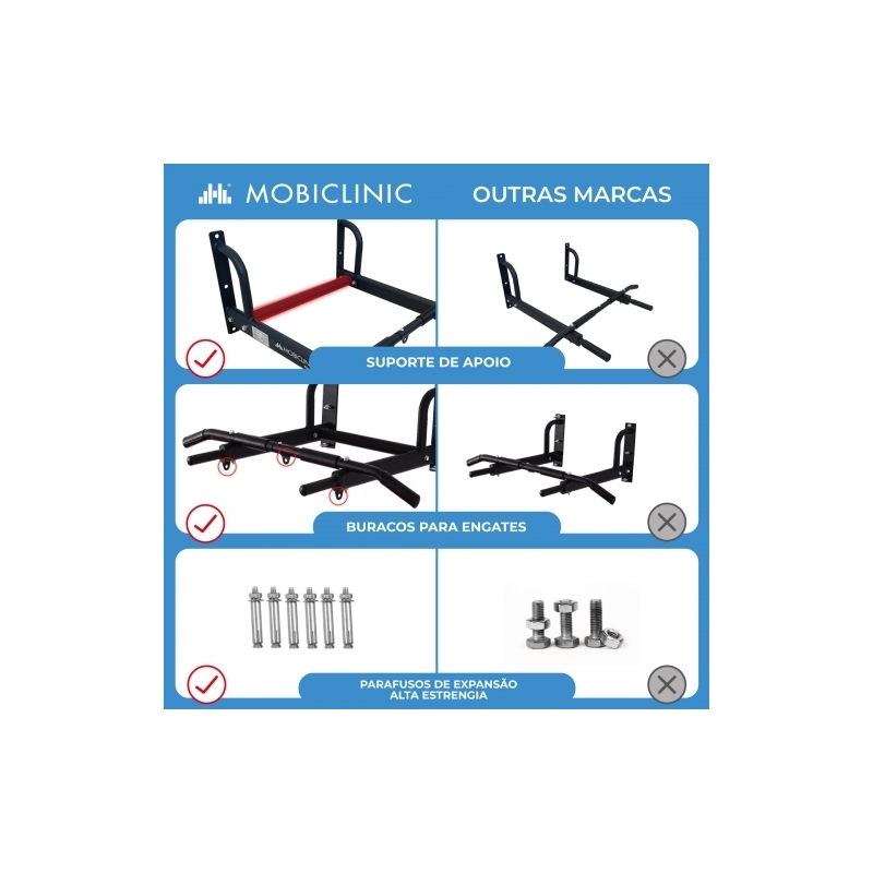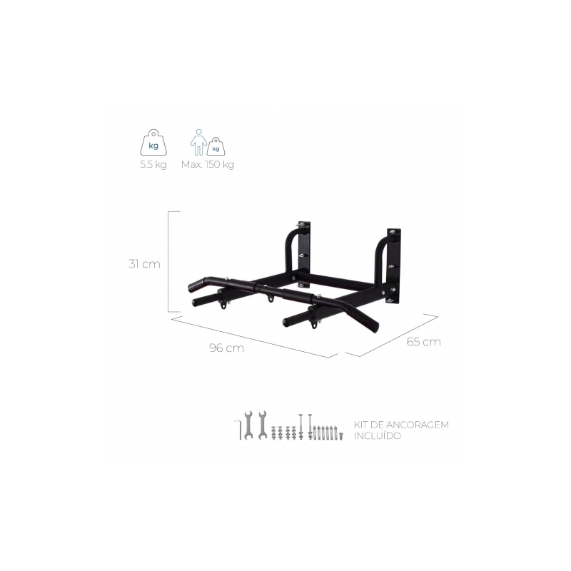 - A barra pull up foi projetada para ser fixada na parede, proporcionando grande estabilidade e suportando uma carga máxima de 150 kg. Para isso, inclui um kit de ancoragem que facilita a instalação da barra. Sua estrutura foi pensada para poder treinar de forma intensa e confortável , podendo realizar diferentes pegadas, como pronação e supinação das mãos, além de variar a distância entre as mãos na pegada.