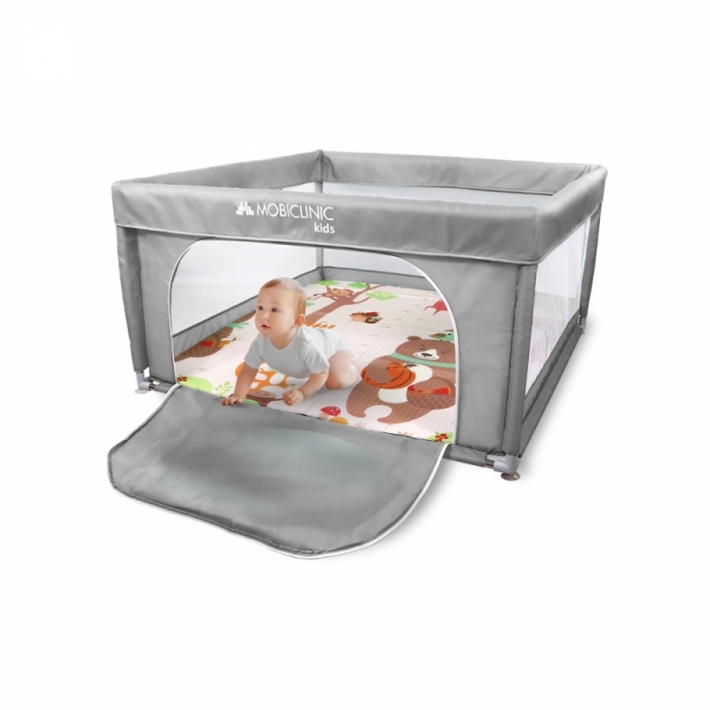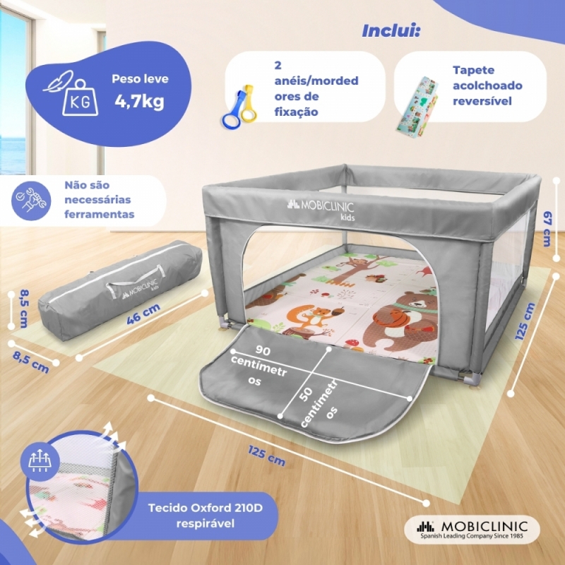 Cercadinho com carpete | Bebês e crianças | 125x125x67cm| Dobrável | Bolsa de transporte | Cinza | Happyland | Mobiclinic