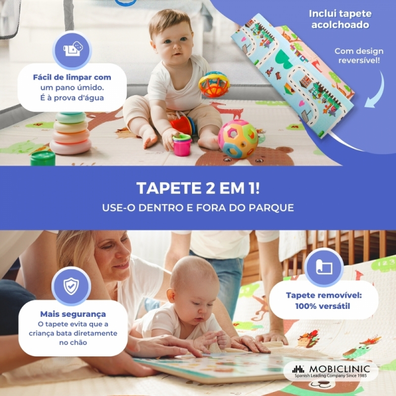 Inclui um tapete acolchoado que proporciona conforto e proteção . Além disso, você pode usar o tapete dentro e fora do parque .