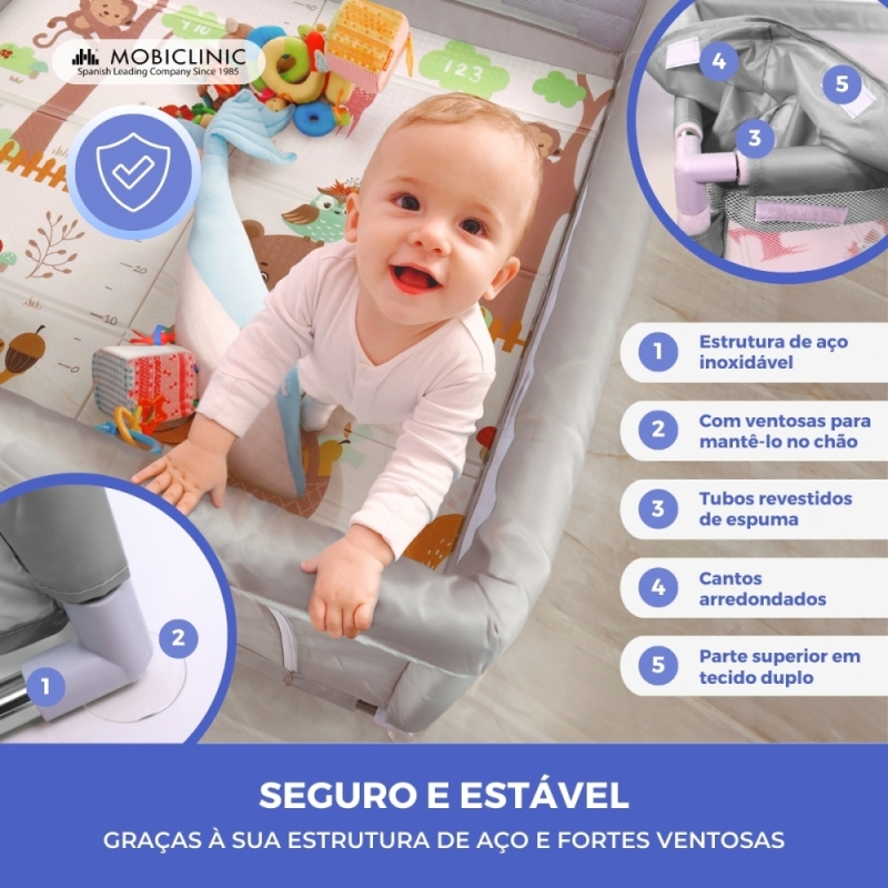 FIXAÇÃO AO PISO E SEGURANÇA: Equipado com fortes ventosas , adere ao solo com a máxima segurança, evitando movimentos indesejados ou tombamento do cercadinho. Os cantos são arredondados e os tubos revestidos de espuma .