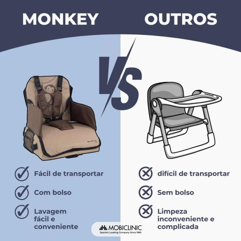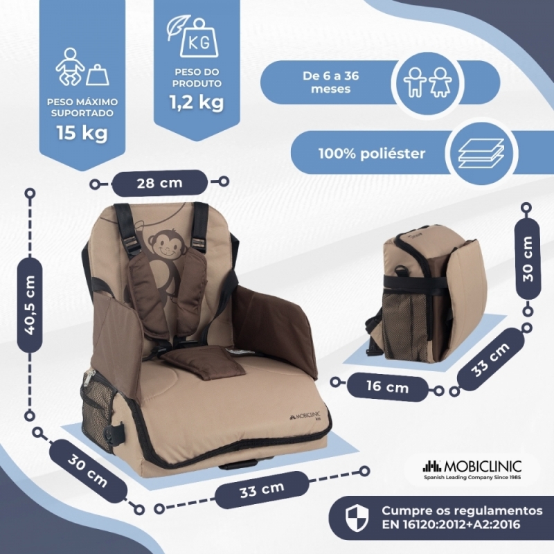 Cadeira alta de viagem com arrumação| Para bebés | Dobrável | Com bolso e pega | Até 15 kg | Bege | Monkey | Mobiclinic