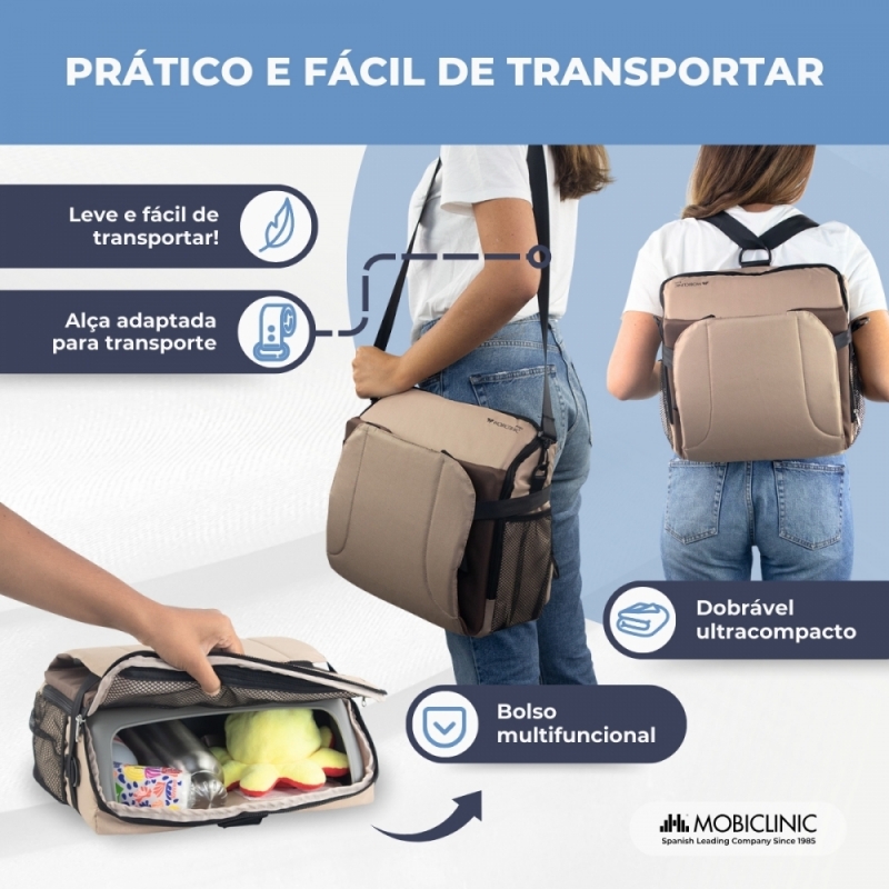 MULTIFUNÇÕES: Permite transportar utensílios como fraldas, biberões, toalhitas, carteira, telemóvel... ao mesmo tempo que uma cadeira de bebé, oferecendo a possibilidade de aceder aos mesmos enquanto a criança está sentada. Graças ao seu bolso e às suas alças, esta cadeira alta pode ser convertida em bolsa ou mochila.