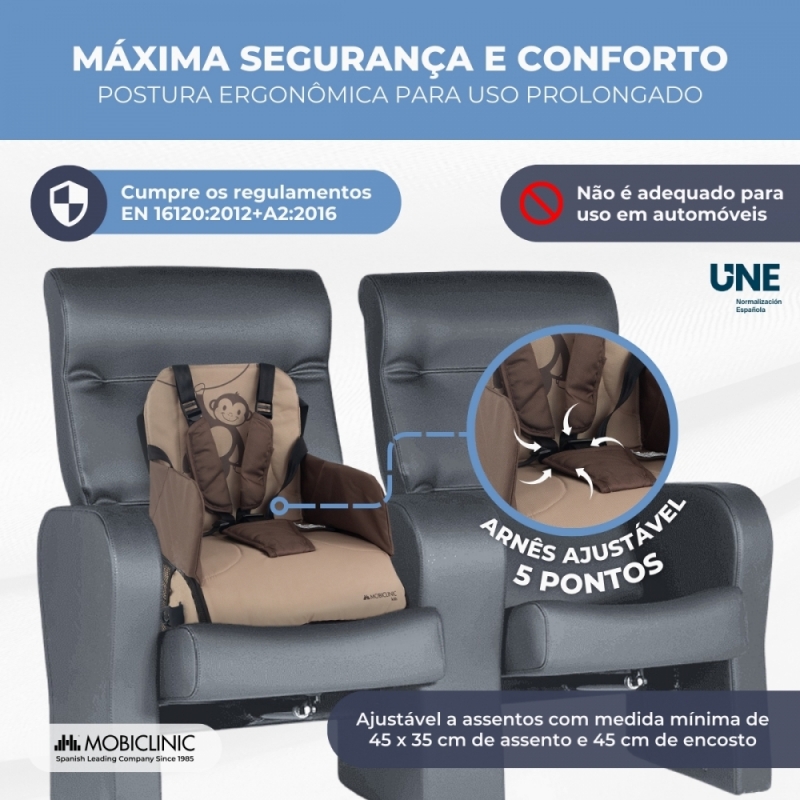 - Ajustável a assentos com as seguintes medidas mínimas: assento 45 x 35 cm e encosto 45 cm (ver última imagem)