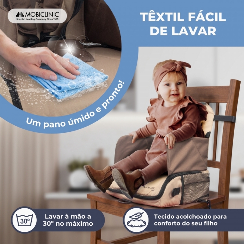 FÁCIL MANUTENÇÃO : Graças ao material com que foi fabricada a cadeira alta, basta passar um pano com água (até 30º) para retirar as manchas que nela tenham ficado.