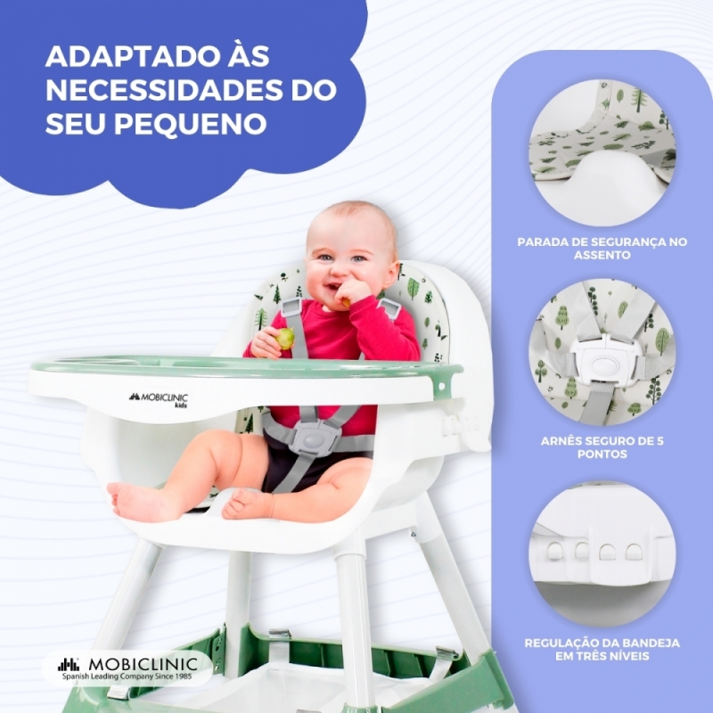 A cadeira alta Forest destaca-se pela sua capacidade de ajuste em duas alturas diferentes , permitindo a sua utilização tanto como cadeira alta como baixa . Esta característica torna-o uma opção multifuncional e evolutiva , adaptando-se às novas necessidades do seu filho à medida que cresce. Quer seja na hora das refeições, na hora de brincar ou em qualquer outra atividade, a cadeira alta Forest permite que o seu filho aprenda a diferenciar entre alimentação e hora de brincar.