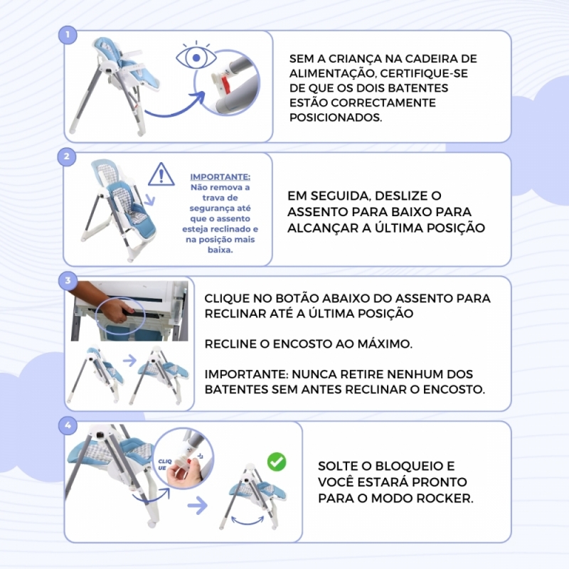 - Pode ser usado como cadeira alta ou balanço