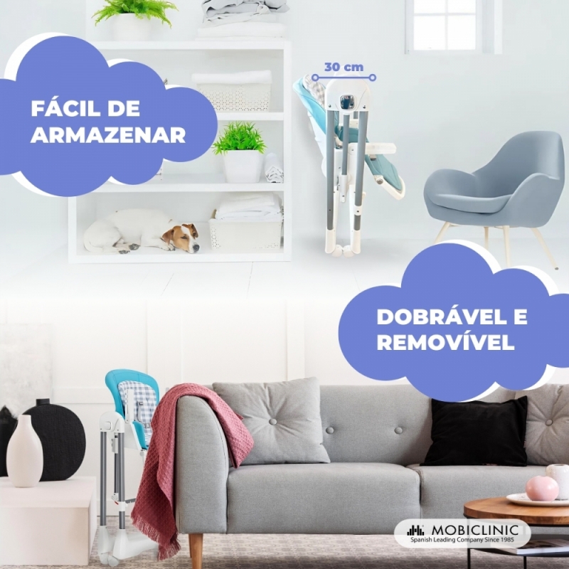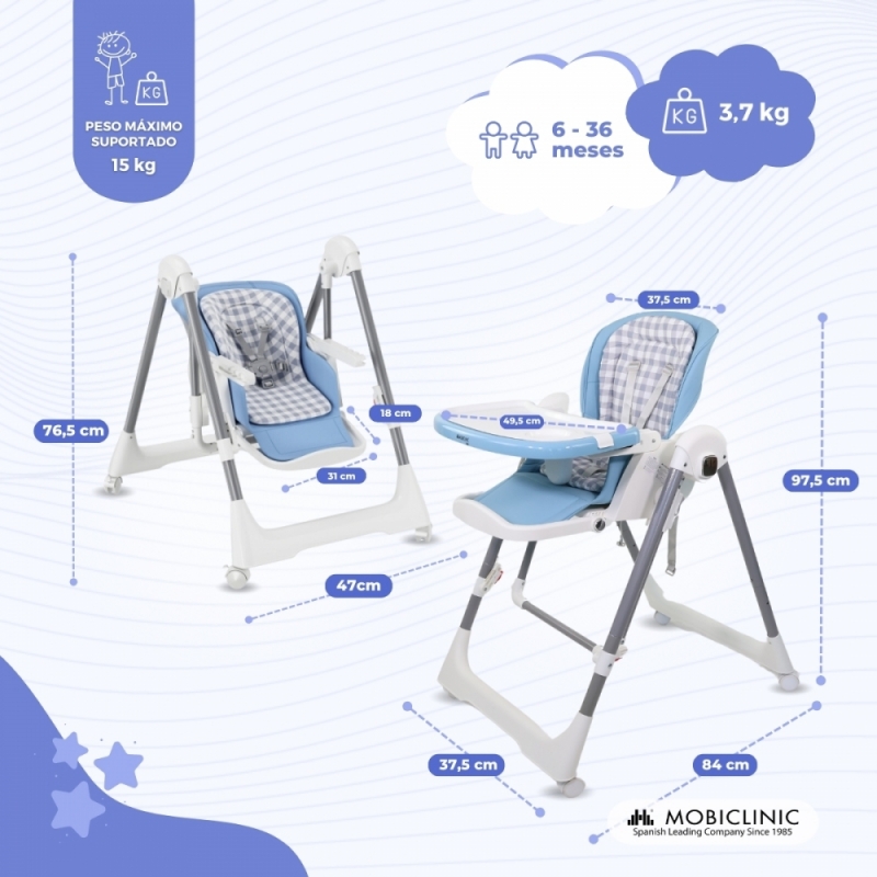 Cadeira alta e baloiço | Dobrável | Rodas e bandeja | Capacidade máx 15kg | 6-36 meses | Ajustável | Azul | Nala | Mobiclinic