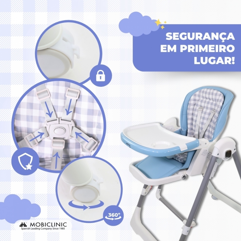 A segurança é a nossa prioridade , com arnês de 5 pontos e freios nas rodas e giro para evitar quedas . Suas 4 rodas giratórias de 360º permitem total manobrabilidade. A bandeja dupla removível em 3 posições é fácil de limpar e o sistema de dobramento simples permite que seja guardada em qualquer espaço pequeno.