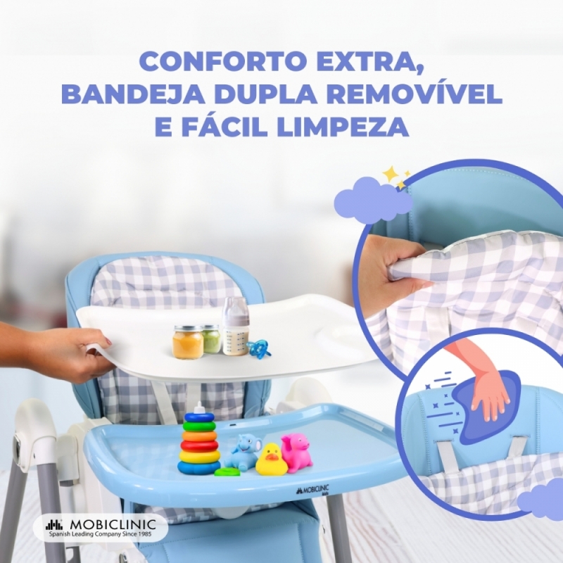 - Seu conforto extra: a cadeira alta tem uma almofada branca macia e fofa
