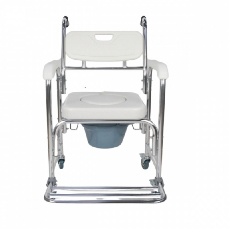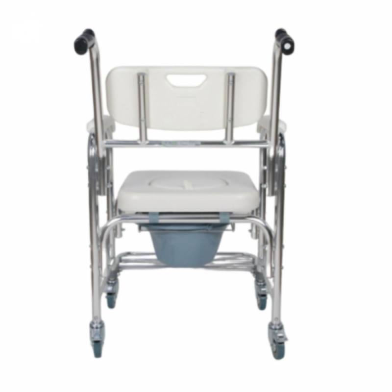 É versátil e pode ser usada como cadeira sanitária, cadeira de banho, elevador de assento de vaso sanitário e cadeira de transferência, adaptando-se às necessidades de todos os usuários. Possui freios nas quatro rodas para maior segurança e para evitar movimentos involuntários.