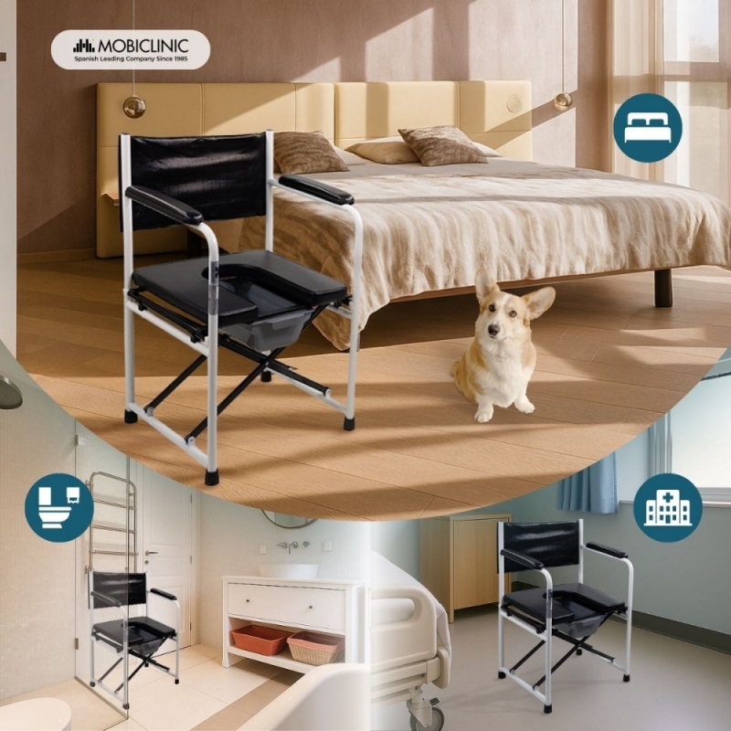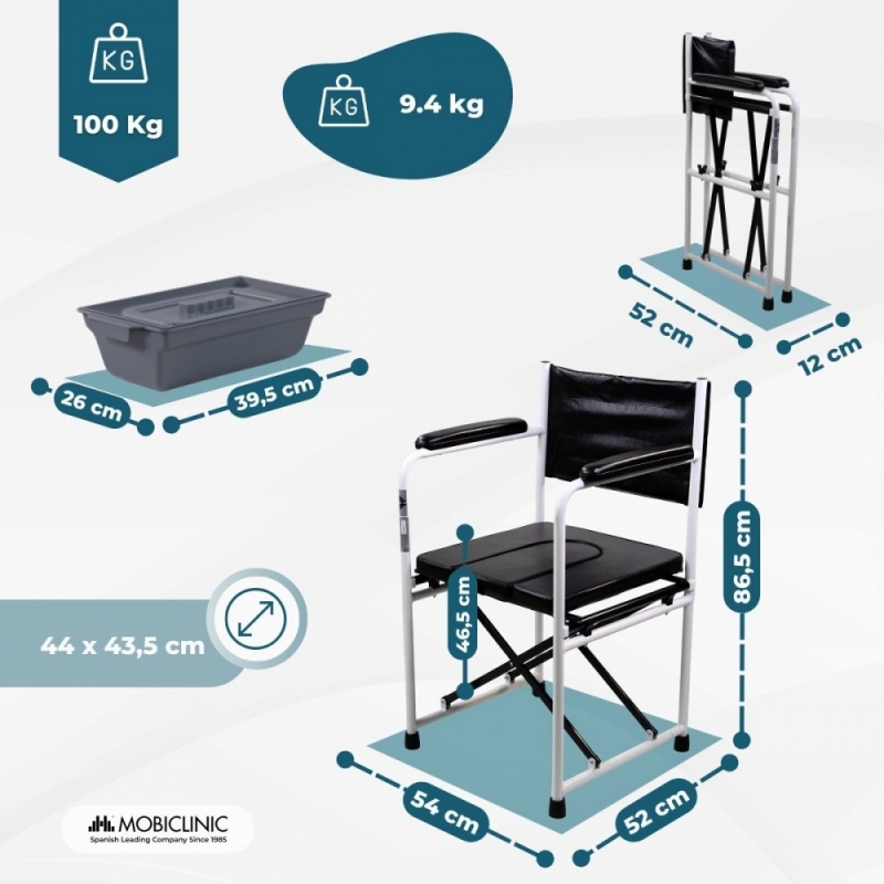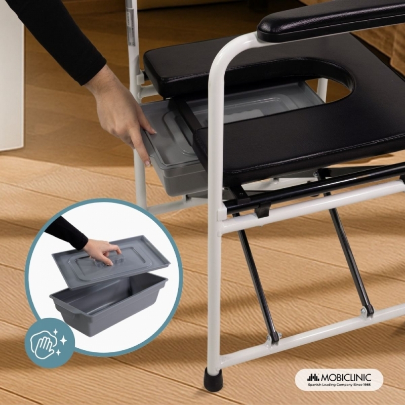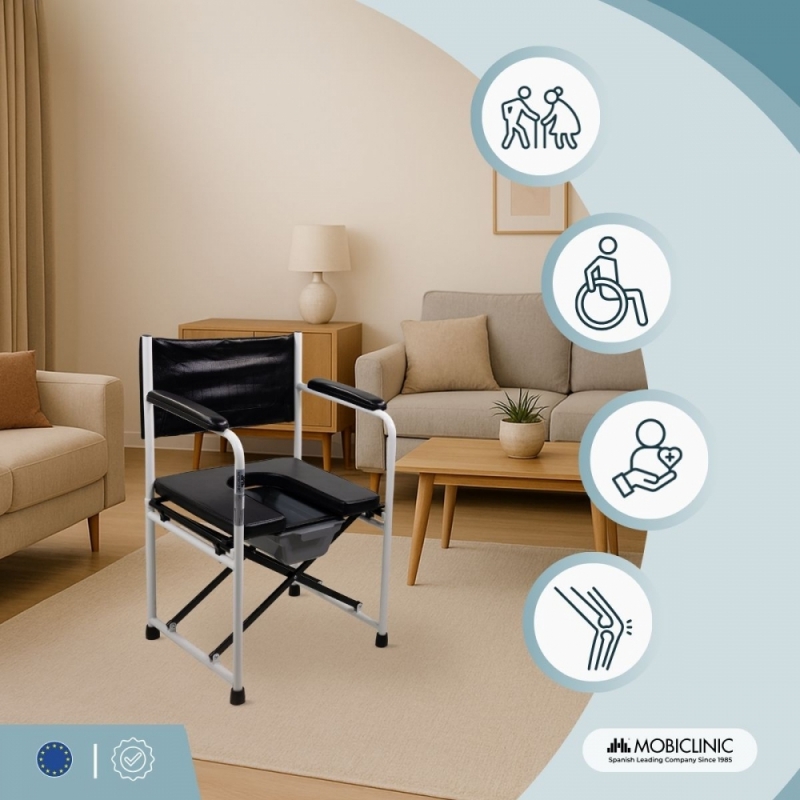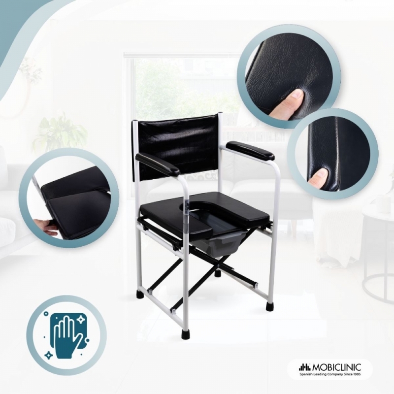 Esta cadeira sanitária incorpora apoios de braços confortáveis e almofadados, o seu tamanho e capacidade de dobrar tornam-na adequada para todos os tipos de lugares.