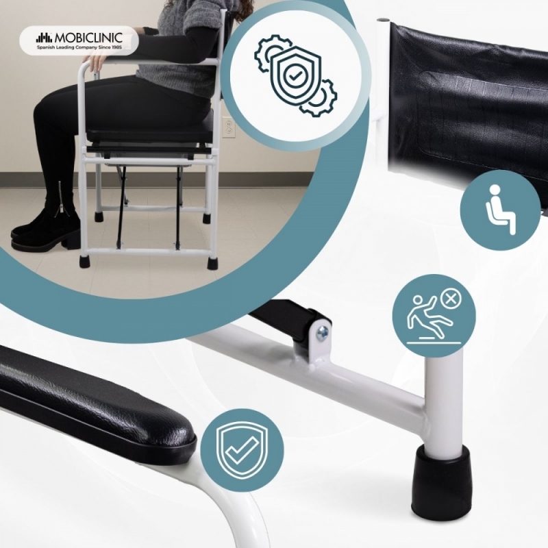 A cadeira sanitária dobrável também tem um amplo encosto e assento para um conforto extremo.