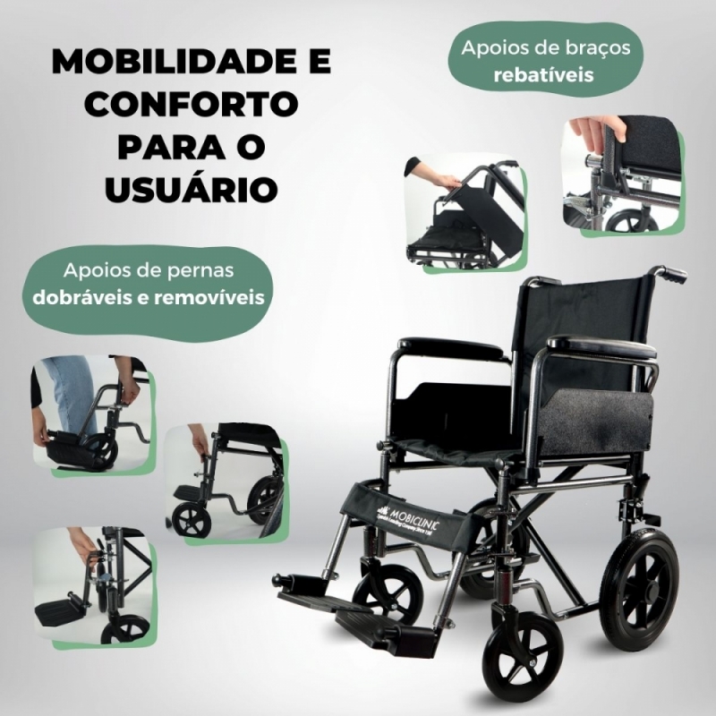 Outro diferencial desta cadeira de rodas para idosos com rodas pequenas é que os apoios de braços do usuário são dobráveis , o que facilitará para o cuidador a transferência do paciente de qualquer lugar para a cadeira de rodas.