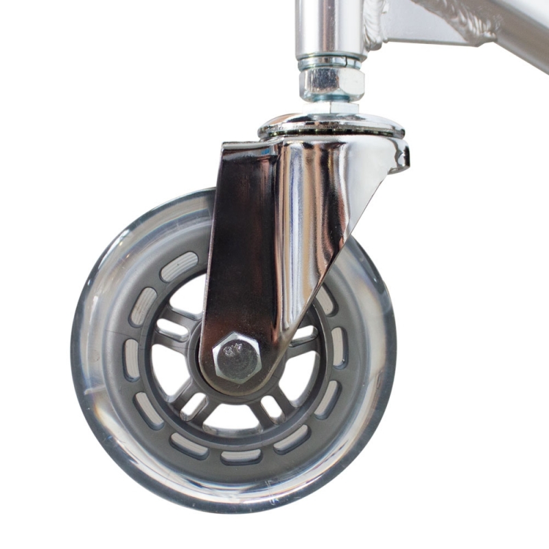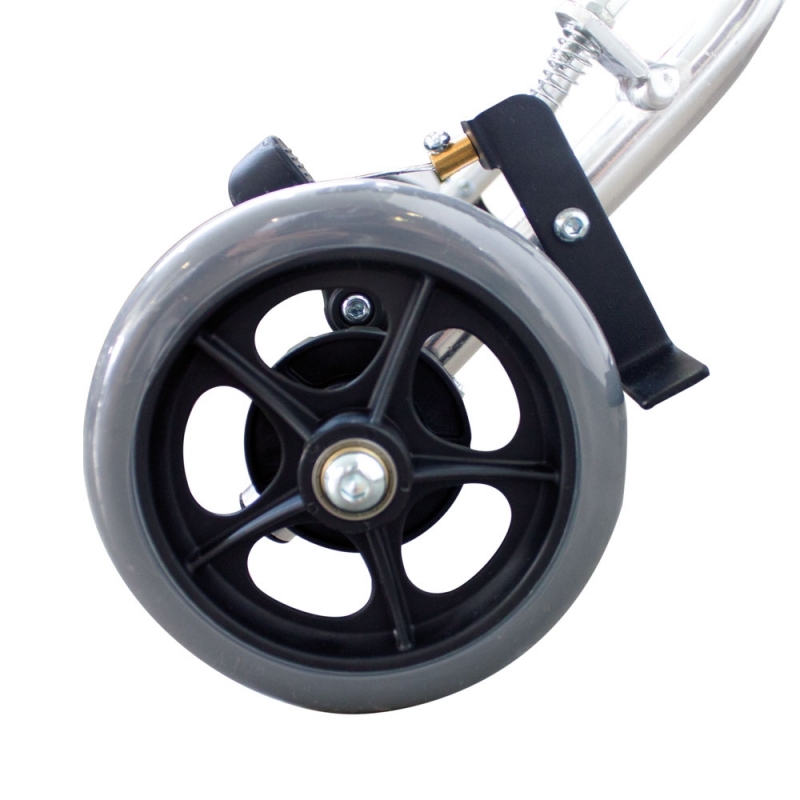 SEGURANÇA MÁXIMA – As rodas traseiras sólidas de 15 cm desta cadeira de rodas de transferência proporcionam estabilidade e movimento seguro. Possui freio no guidão.