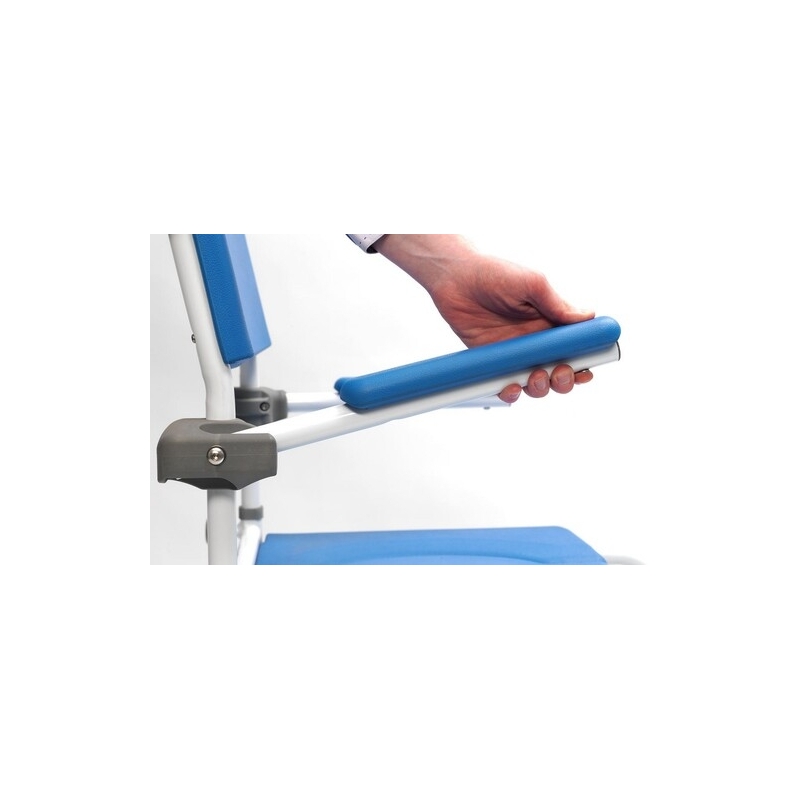 Esta cadeira de duche e WC da Aston traz funcionalidade, conforto e qualidade ao duche do seu paciente. Pode ser utilizado como duche e sanita graças ao seu equipamento. Tem todos os avanços em manobrabilidade e conforto: quatro rodas multidireccionais com travões, apoios de braços macios e fáceis de dobrar, um apoio de pés dobrável, amovível e ajustável em altura, um assento flexível com bacia amovível para utilização em sanitas. O assento e o encosto são feitos de espuma de alta densidade, não deformável, impermeável e desinfectável. A taça de grande capacidade (5 litros) com tampa pode ser retirada da parte de trás. O encosto pode ser removido para facilitar o transporte.