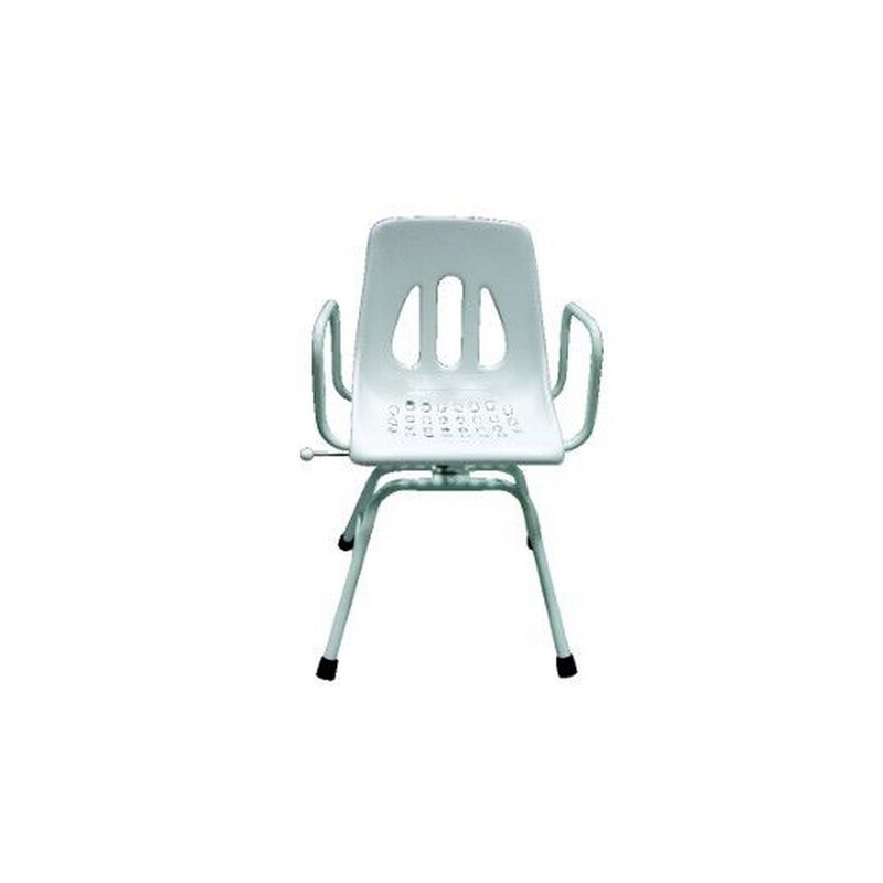 Una práctica silla de ducha que se puede girar en el plato de ducha.