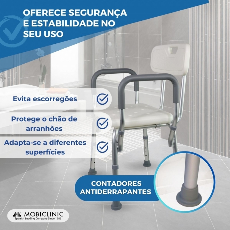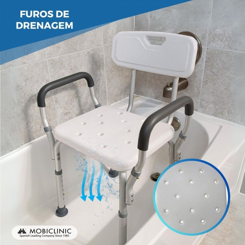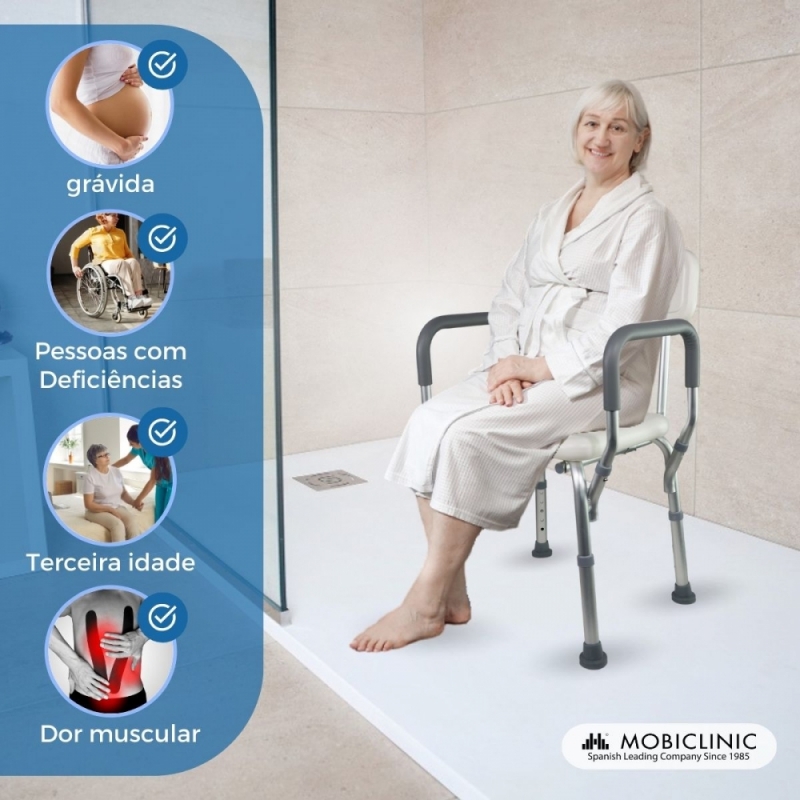 A cadeira de banho modelo Puerto com encosto e apoios de braços é ideal para idosos ou pessoas com problemas de mobilidade reduzida para desfrutar do banho de maneira confortável e segura.