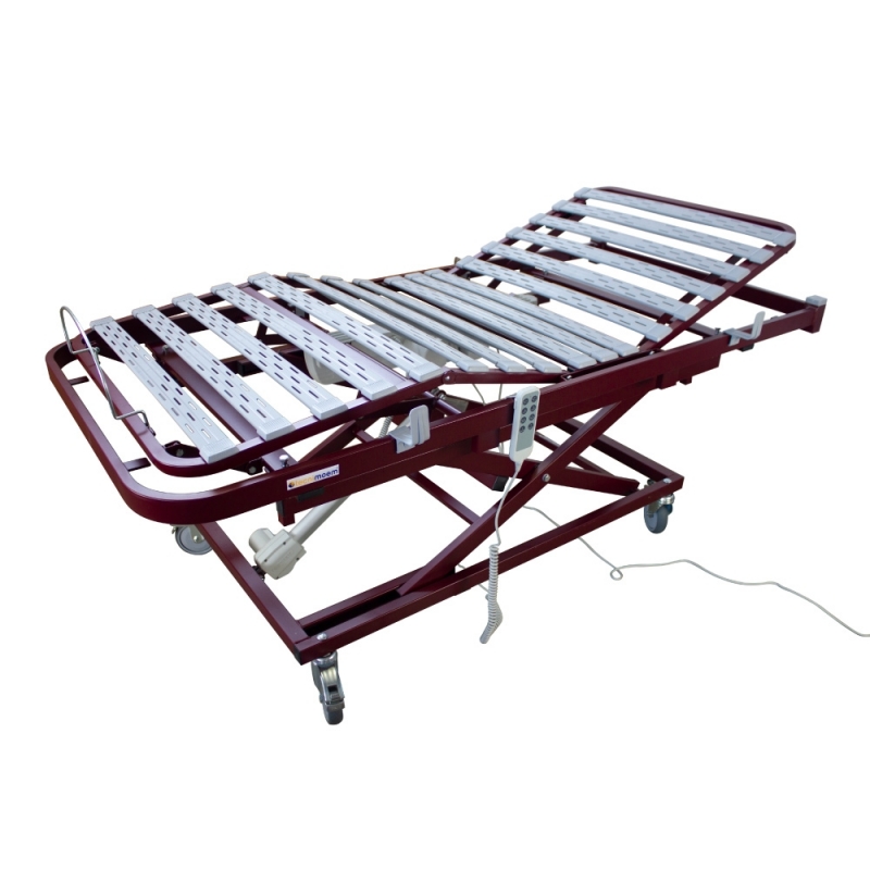 Os quatro planos articulados com ripas ergonómicas permitem um ajuste óptimo de todo o corpo. Além disso, estas ripas estão equipadas com canais de ventilação e higiene. O tamanho e as rodas desta cama articulada tornam-na facilmente transportável e requer muito pouca montagem.
