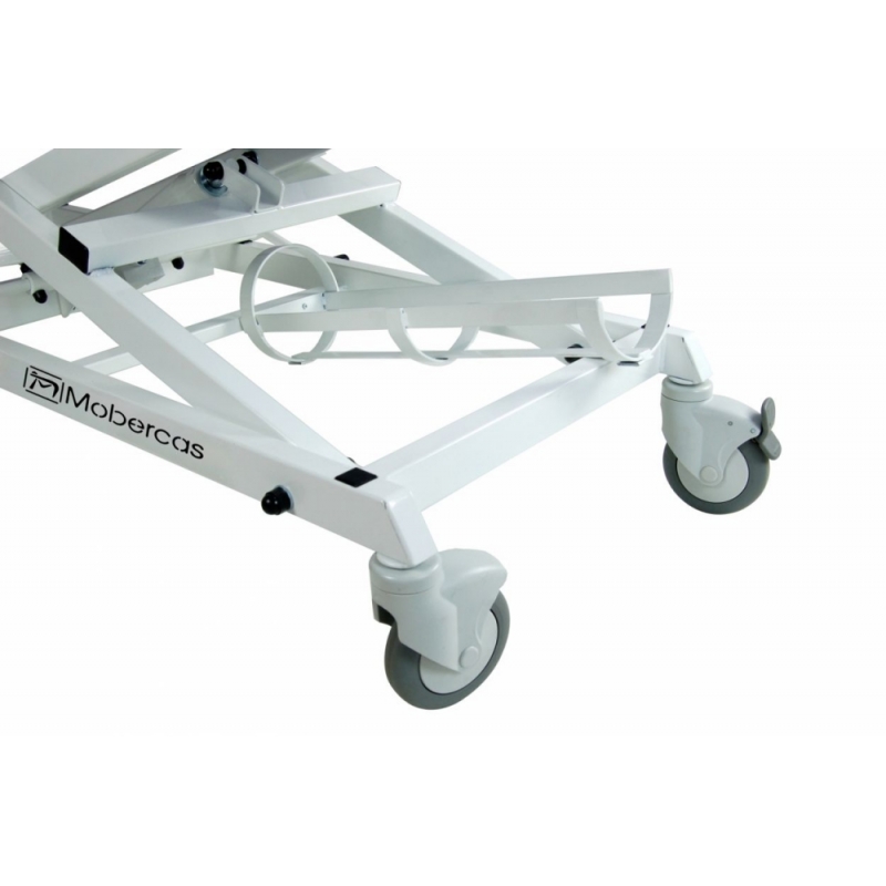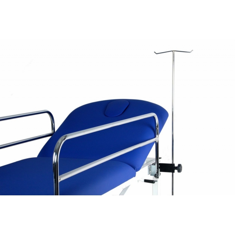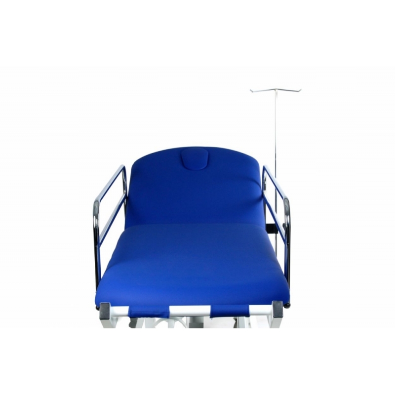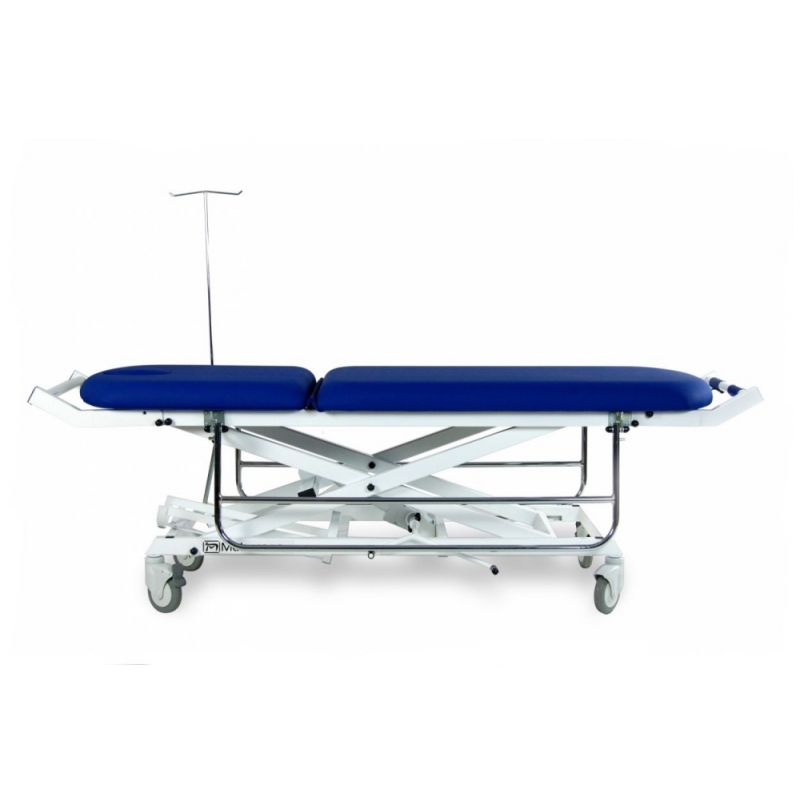 Carro de transferência hidráulica de 2 seções com corrimão, suporte de soro, suporte de cilindro, botões de pressão removíveis e dobráveis (na cabeça e no estribo) e rodas de transporte de 125 mm.