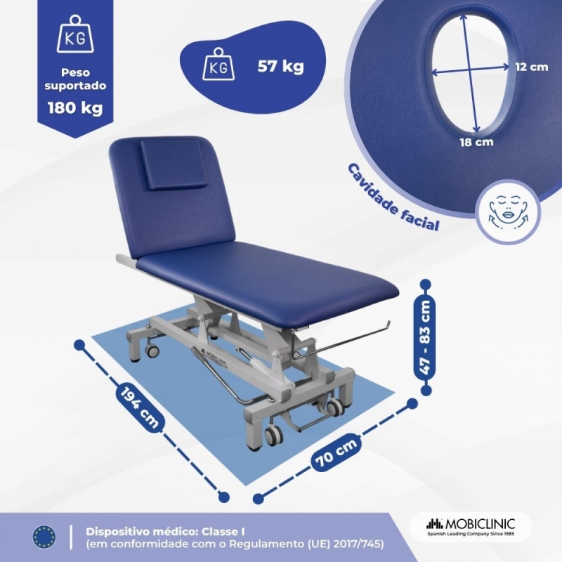 Seu design inclui uma abertura facial anatômica de 11 x 18 x 8,5 cm com um tampão acolchoado para maior conforto. Também apresenta detalhes pensados para otimizar o trabalho diário, como o suporte integrado para rolos de papel da maca. Sua capacidade de carga é de até 180 kg e é adequada para usuários com mais de 146 cm de altura, oferecendo segurança.