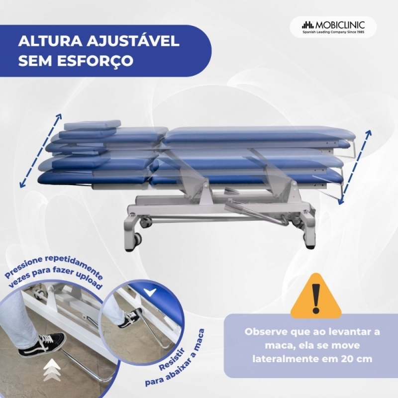 SISTEMA HIDRÁULICO: A maca possui um sistema de ajuste de altura assistido por pedal que a eleva ou abaixa suavemente, mesmo com o paciente sentado. Também possui alavancas laterais acessíveis de ambos os lados, agilizando o trabalho dos profissionais.