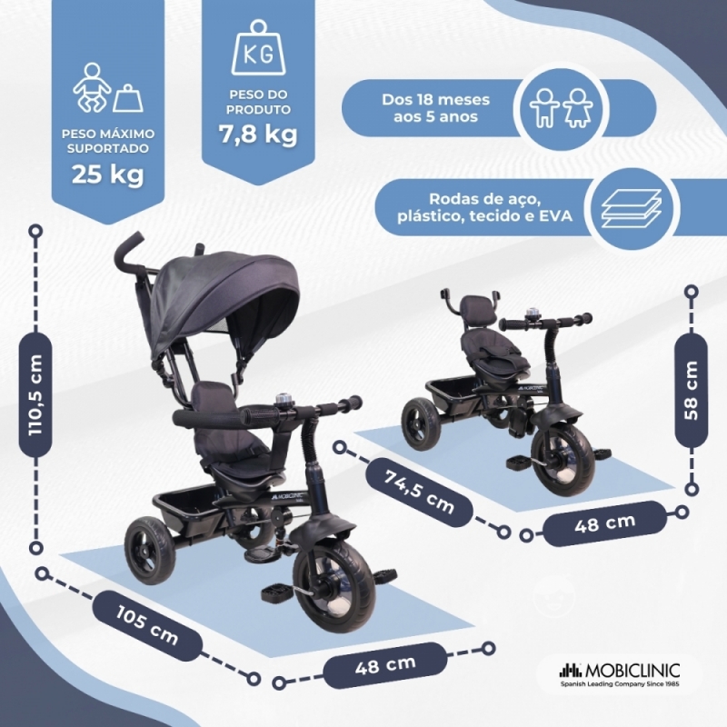 Medindo 111 x 104 x 48 cm e pesando 7,5 kg , este triciclo é fabricado para ser resistente e ao mesmo tempo fácil de manusear. Este produto suporta um peso máximo de 25 kg por usuário.