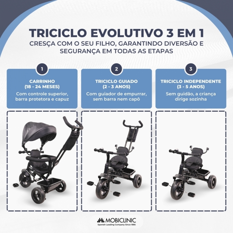 Seu design 3 em 1 permite: O Triciclo Evolutivo Mod LULU 3 em 1 se adapta ao crescimento da criança, oferecendo três modos de uso: