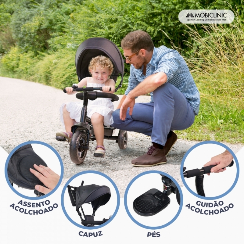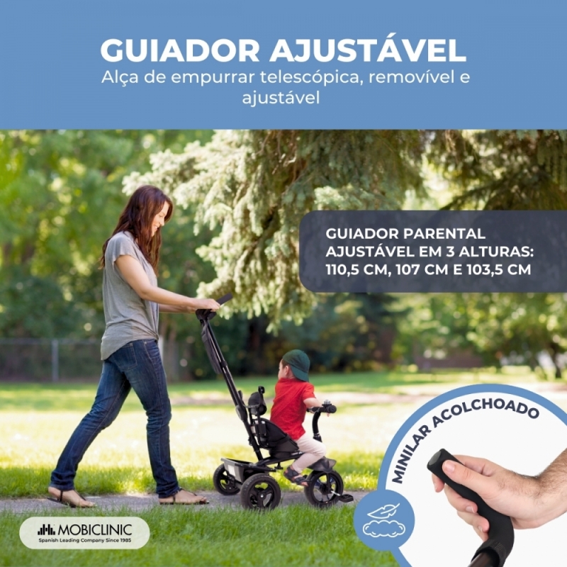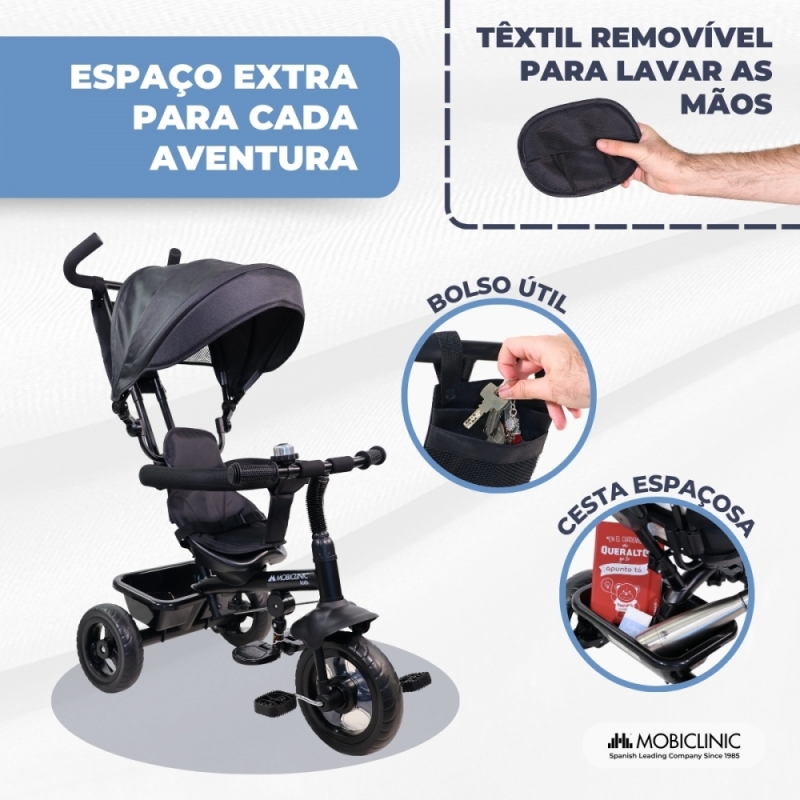 Este triciclo foi pensado para oferecer uma experiência confortável e prática tanto para as crianças quanto para os pais, sendo uma excelente opção para o uso diário. Possui assento e encosto acolchoados que garantem o conforto dos mais pequenos, capuz regulável para protegê-los do sol e do vento e espaço de armazenamento com cesto inferior para transportar brinquedos, mochilas ou qualquer outro item necessário durante a caminhada, e uma bolsa na alça superior para guardar itens menores. Este sistema de arrumação duplo permite aos pais transportar facilmente tudo o que necessitam sem transportar objetos adicionais. A pega é regulável em 3 alturas: 111 cm – 107,5 cm – 105 cm, o que proporcionará maior conforto aos pais.