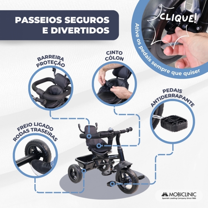 SEGURO : O triciclo possui cinto de segurança e barreira protetora. Além disso, inclui freio na roda traseira e botão de embreagem, que permite à criança utilizar os pedais sem mover o volante para maior segurança. Os pneus compostos EVA podem ser usados tanto dentro como fora da cidade e oferecem um passeio suave e silencioso.