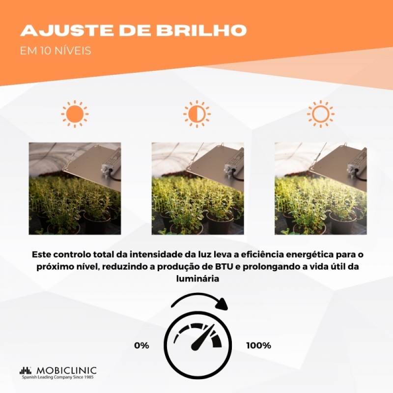 EFICIÊNCIA ENERGÉTICA: Esta luz de planta inclui 10 níveis de brilho ajustáveis (10%,20%,30%, 40%,50%, 60%,70%, 80%,90% e 100%), permitindo que você escolha o mais adequado brilho para suas plantas, ajustando individualmente a intensidade da luz de espectro total, luz vermelha 660 nm + IR 730 nm e luz bule 460. Este controlo total da intensidade luminosa permite levar a eficiência energética ao próximo nível, reduzindo a produção de BTU e prolongando a vida útil da luminária.