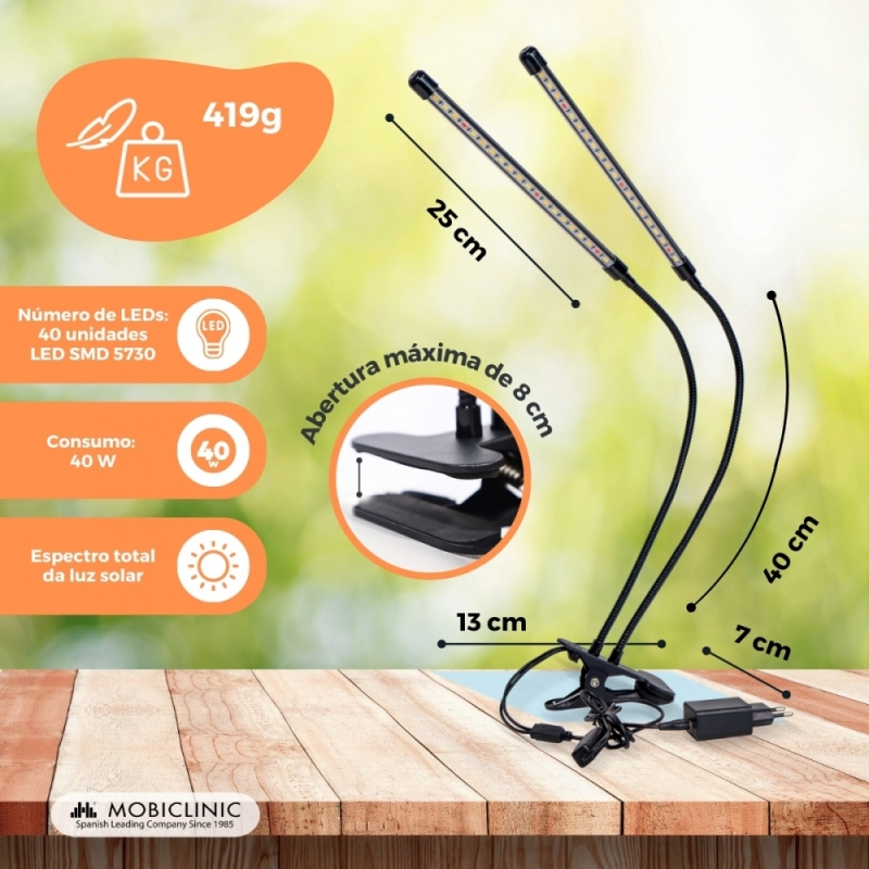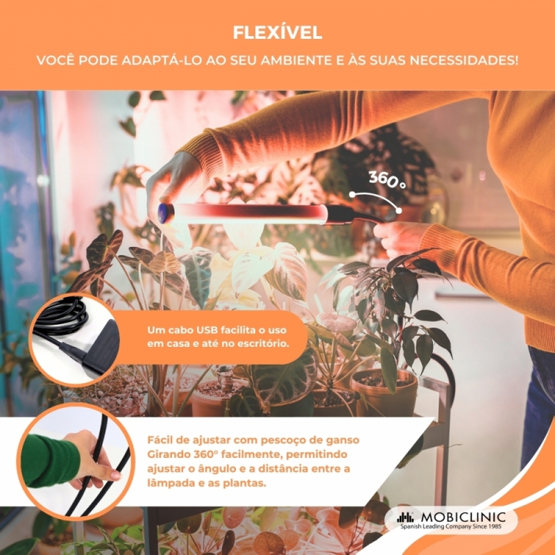 Flexibilidade é fundamental quando se trata de cuidar de suas plantas. Graças ao seu pescoço de ganso de 360°, que ajusta o ângulo e a distância entre a lâmpada e as suas plantas. O cabo USB torna-o conveniente e versátil de usar.