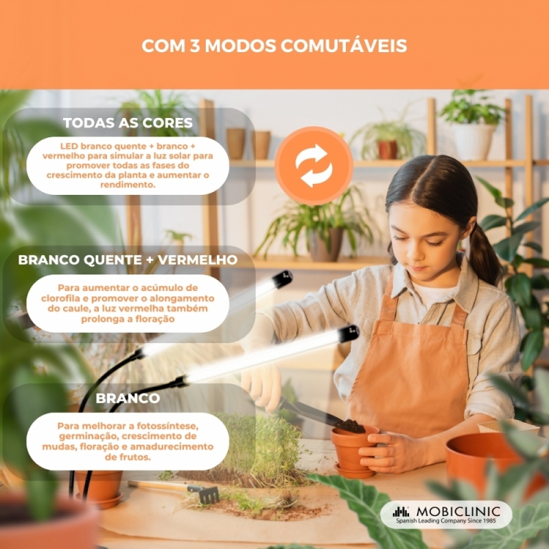 A lâmpada possui 3 modos comutáveis para se adaptar a cada estágio de crescimento: