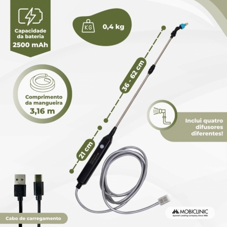 Possui uma haste telescópica extensível de 60 a 85 cm e uma mangueira de 3 metros que facilitam o acesso a áreas de difícil acesso. Também inclui quatro bicos intercambiáveis que se adaptam a múltiplas tarefas: um bico omnidirecional de 4 furos, um bico seccional de 360°, um bico de 6 furos e um bico de nebulização de água.
