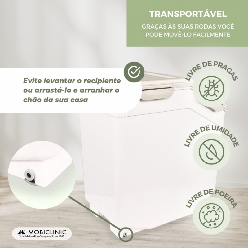 TRANSPORTE PRÁTICO: Este recipiente para alimentos possui duas rodas na parte traseira para facilitar o transporte, o que pode ser útil caso você precise mover o recipiente de um lugar para outro.