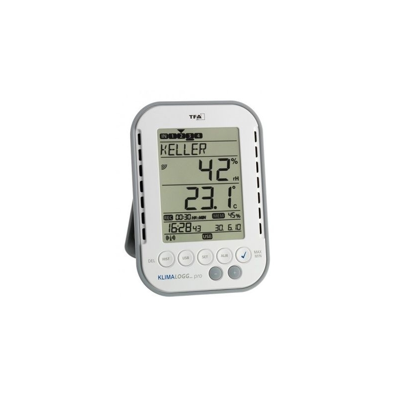 Este termo-higrômetro é usado para medir a temperatura e a umidade relativa de um ambiente. Suporta 8 sensores sem fio externos adicionais (não incluídos).